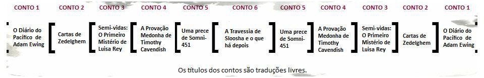A grande sacada de Mitchell é encerrar cada conto com o protagonista lendo ou observando a história cronologicamente anterior a sua, o que estabelece o elo entre as narrativas – através de um diário ou de um filme, as histórias repercutem pelo tempo e o espaço. Deste modo, a viagem do leitor termina exatamente onde começou: no Pacífico Sul do século dezenove.