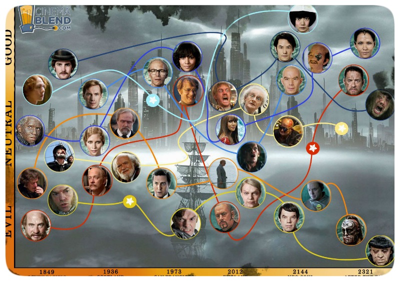 Cloud Atlas era considerado por muitos como um livro impossível de adaptar para o cinema. O próprio Mitchell reconheceu que sua estrutura aninhada, de uma história contida em outra, era rígida demais para a telona. A solução encontrada pelos Wachowski foi apresentá-las em paralelo, intercalando-as nos momentos em que as similaridades de situações explicitavam as ligações e recorrências – por exemplo, nas cenas de confronto contra o vilão de cada história.