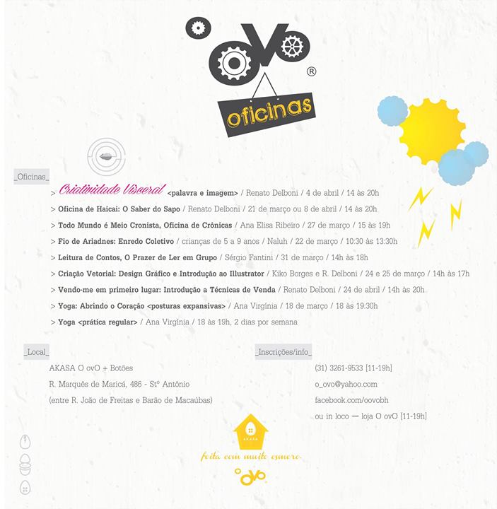 As marcas mineiras de produção em moda e design O Ovo Camisetas Significativas e Botões estão promovendo uma série de oficinas nos próximos dias. Tem de tudo: haicai, crônicas, contos, criação vetorial, yoga. Inscrições, valores e maiores detalhes podem ser conferidos na página do Ovo no Facebook ou nos detalhes deste evento. Confira algumas datas clicando na imagem ao lado.